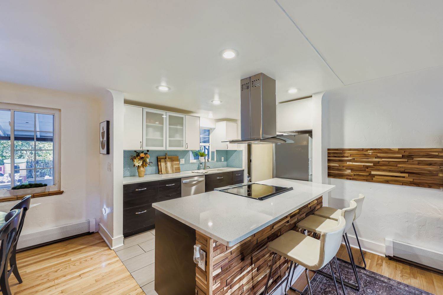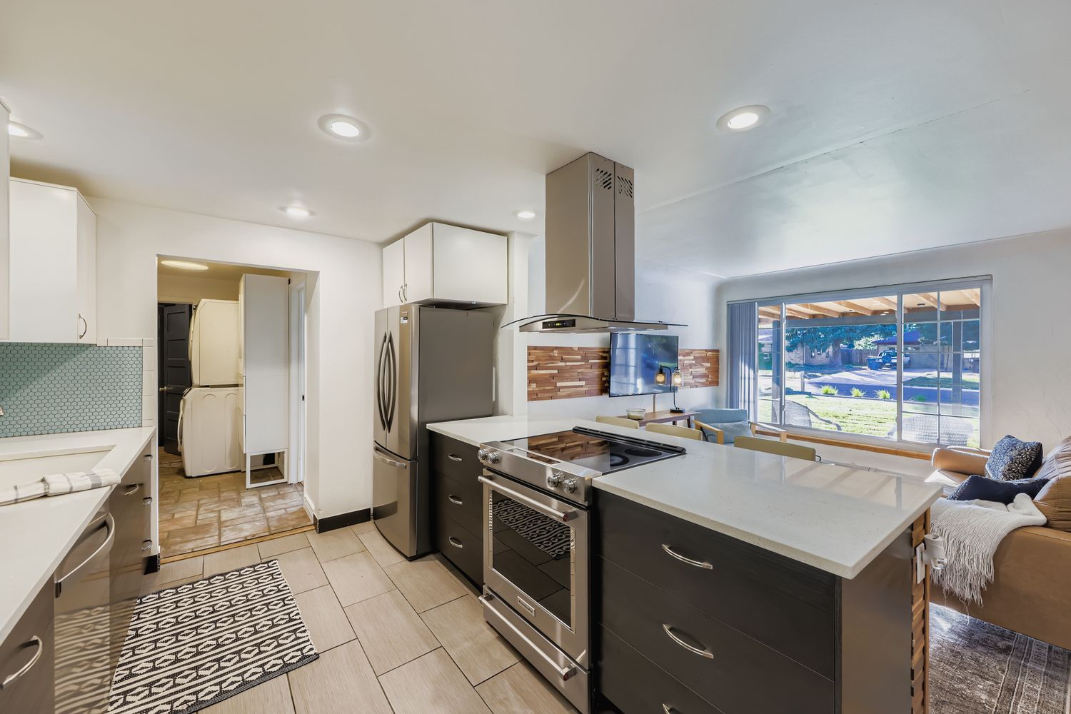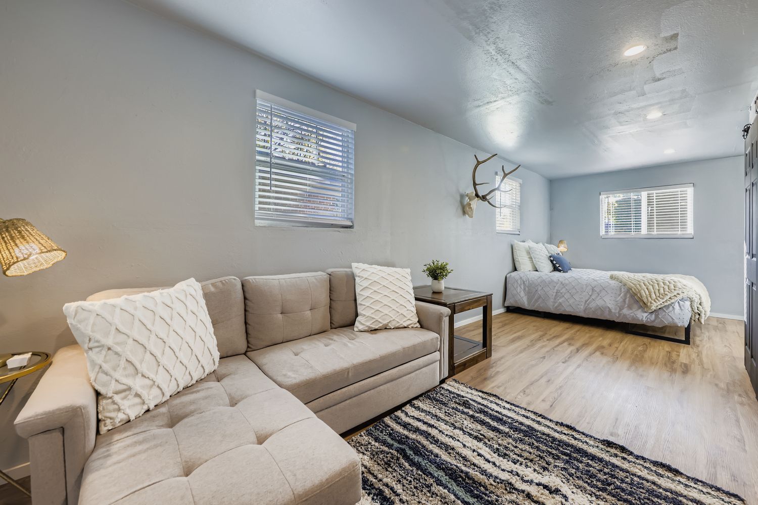 Welcome home! This is the Wheat Ridge mid-century modern ranch you've been waiting for! Fully remodeled and move-in ready, this home features an ideal layout on a spacious lot on a fantastic block. A chic living room and modern kitchen are the perfect combination for hosting or enjoying personally for relaxing evenings in. A split floor plan includes two bedrooms and a bathroom on one end of the home and a large primary suite with a brand new en-suite bathroom on the other. The recently finished bonus room, with its own mini-split HVAC system, can serve many purposes such as a guest suite, second living space, play space, office, recreation room, etc. Enjoy Denver's 300 days of sunshine in the backyard that features plenty of space for outdoor living, dining, cooking, gardening and more. Don't miss your chance to call this your new home!